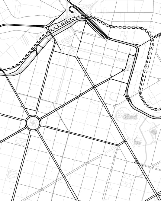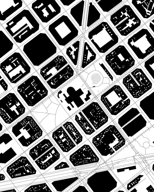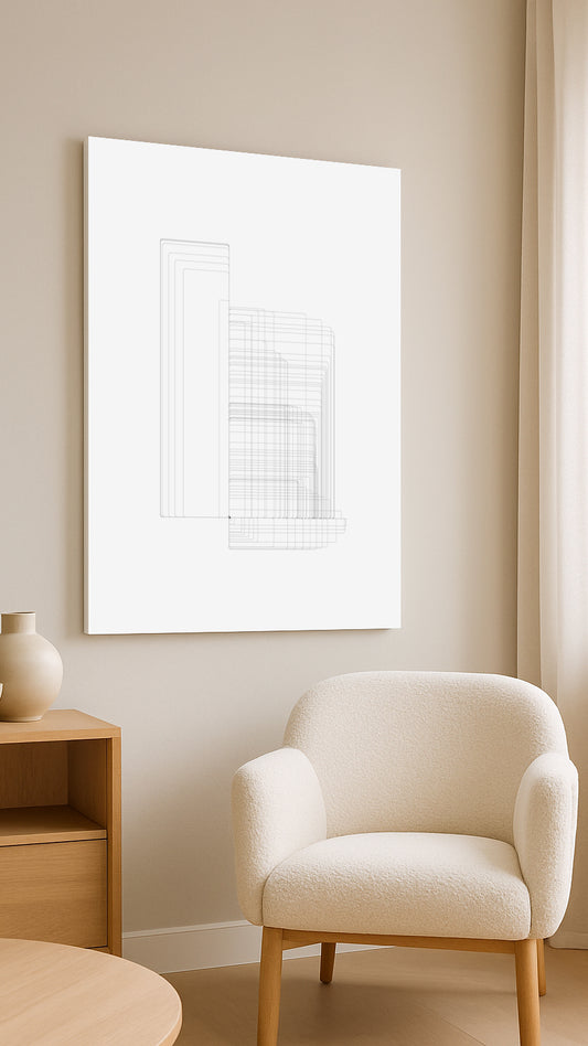 The collection deciphers the spatial DNA of cities through abstract compositions of lines, grids, and intersections. Each work captures the underlying geometries that define urban form those silent structures that shape how we move, dwell, and relate to the built environment. The collection translates architectural patterns into visual rhythms, revealing how cities communicate not just through buildings, but through the invisible logic of their design.